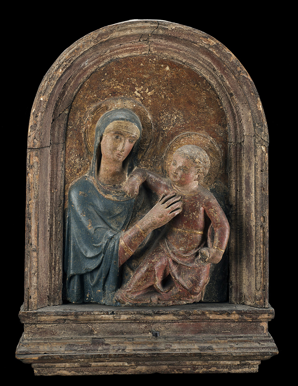 Arte toscana del sec. XV "Madonna con bambino" altorilievo in stucco decorato in policromia (cm 55X38) In cornice coeva in legno dorato Etichette di collezioni al retro 15th-century Tuscan art "Madonna and Child" stucco relief. Framed. Labels to reverse