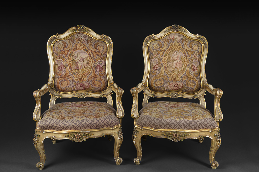 Coppia di poltrone in legno laccato con profili dorati e fregi scolpiti in rilievo a fiori policromi. Tessuti a piccolo punto (lievi difetti) A pair of parcel-gilt and lacquered wood armchairs covered in needlepoint fabric (minor defects)