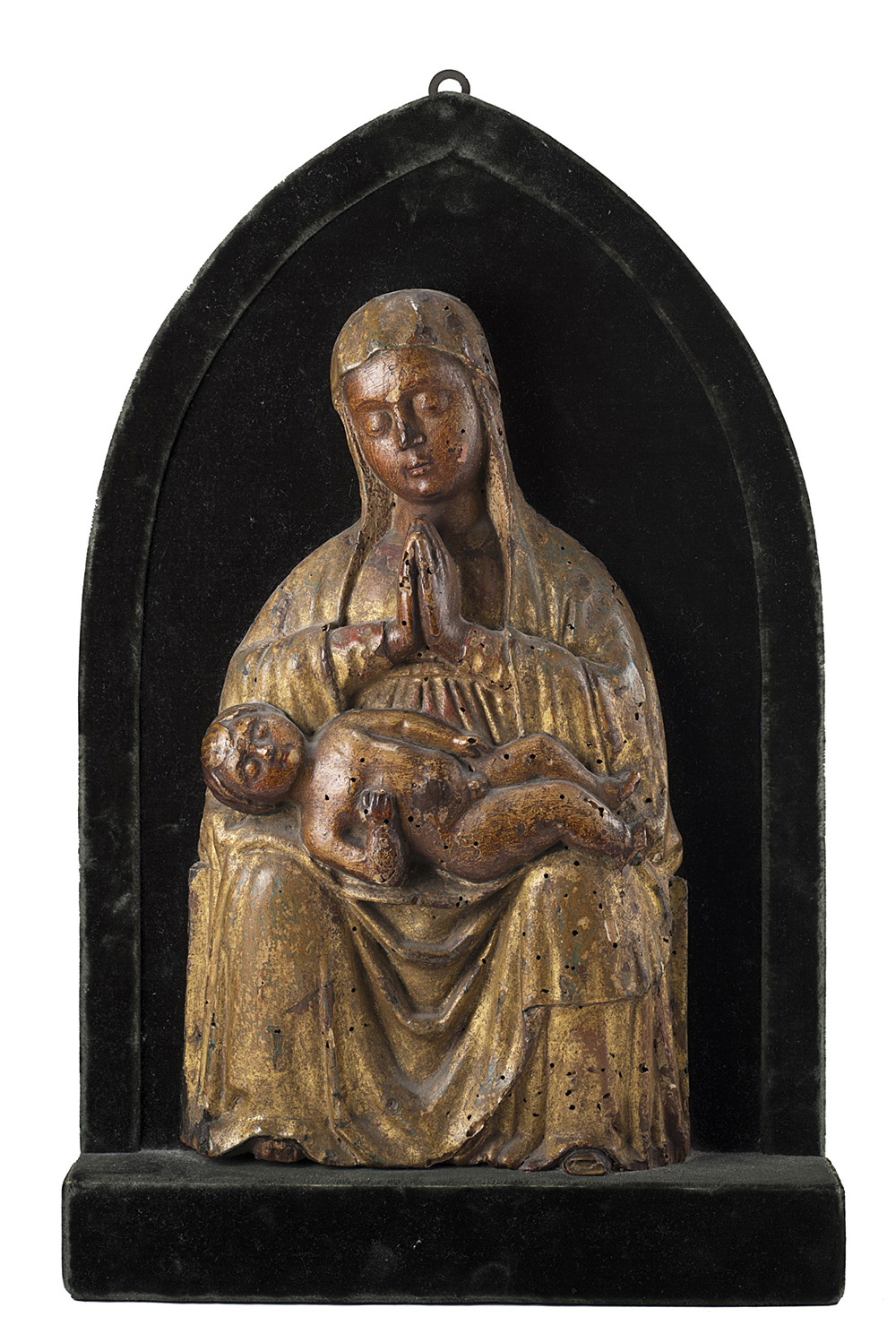 Scultore veneto della seconda met‡ del sec. XV, cerchia di Giacomo Moranzone "Madonna con Bambino" scultura in legno scolpito e dorato montata su pannello in velluto (cm 35x22 col pannello cm 47x39) (lievi difetti) Venetian sculptor of the second half of the 15th century, circle of Giacomo Moranzone "Madonna and Child" wood sculpture (minor defects)
