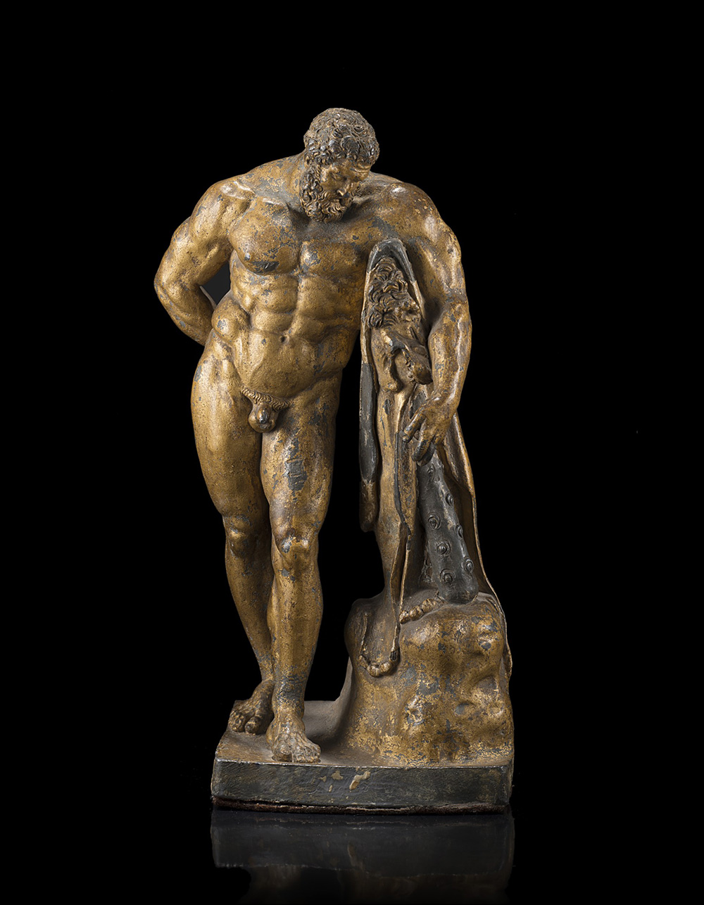 Scultore del sec. XVI/XVII (Europa del Nord ?) Ercole in riposo, del tipo detto ëErcole Farneseí Statuetta in lega di piombo (?) dorata (cm 32,7x18x12,5) (difetti) Per la scheda completa si prega di consultare il catalogo cartaceo Per questo lotto Ë disponibile l'Attestato di Libera Circolazione 16th/17th-century sculptor (Northern Europe ?) "Hercules resting" gilt lead alloy figure (?) (defects) Export license is available for this lot