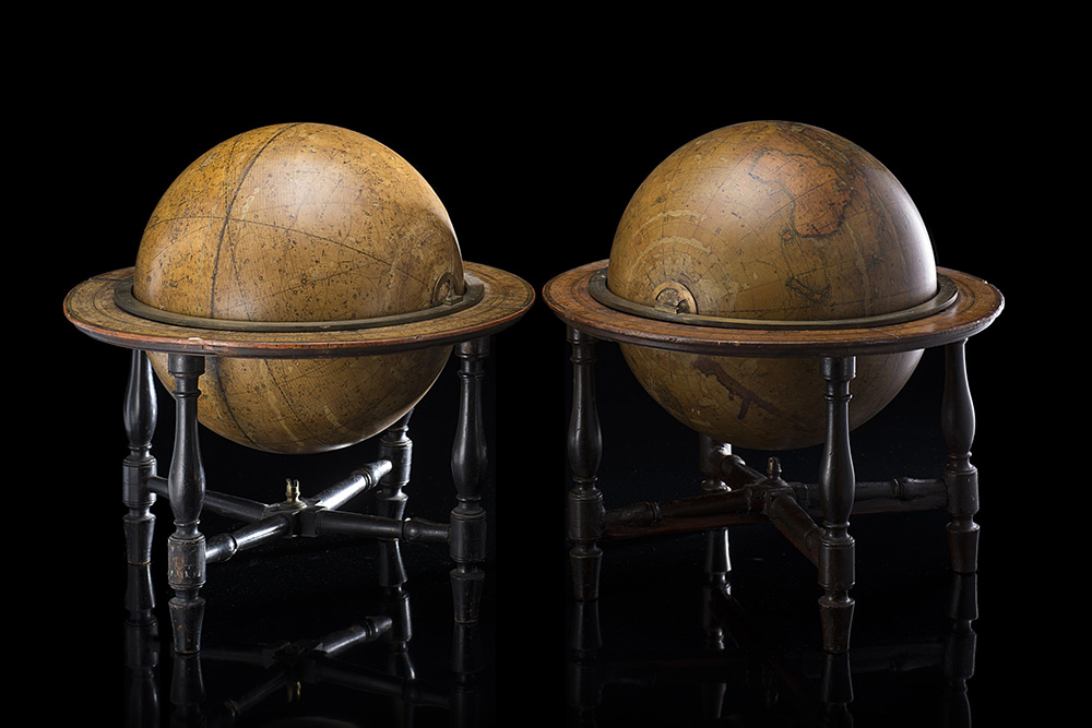 John e William Cary. Globo terrestre e globo celeste con fusi delineati e colorati. Globo con volta celeste inscritto e datato "Cary's new celestial globe on which are correctly lay down upwards 3500 stars...years ago" supporto in legno tornito (h. cm 45) Sec. XIX (difetti e restauri) John and William Cary. 19th-century terrestrial globe and celestial globe (defects and restorations)
