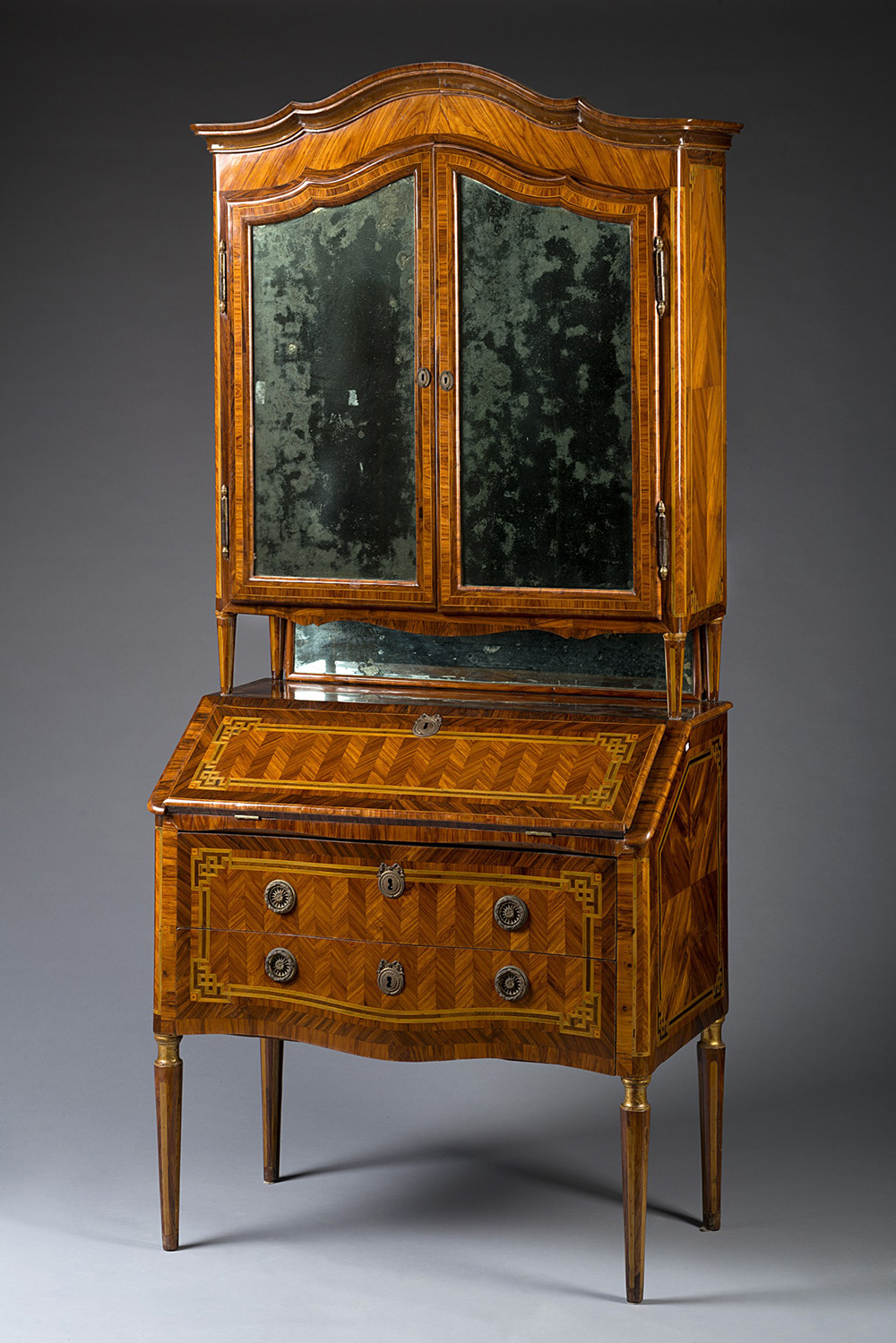 Mobile a due corpi in noce e radica, filettato a motivi geometrici in legni vari, parte superiore a due ante a specchi con cappello sagomato, parte inferiore a due cassetti e anta ribaltabile celante vani e cassettini. Piedi torniti. Piemonte, sec. XVIII (cm 92x202x50) (difetti e restauri) 18th-century Piedmontese walnut and briar-root bureau-cabinet (defects and restorations)