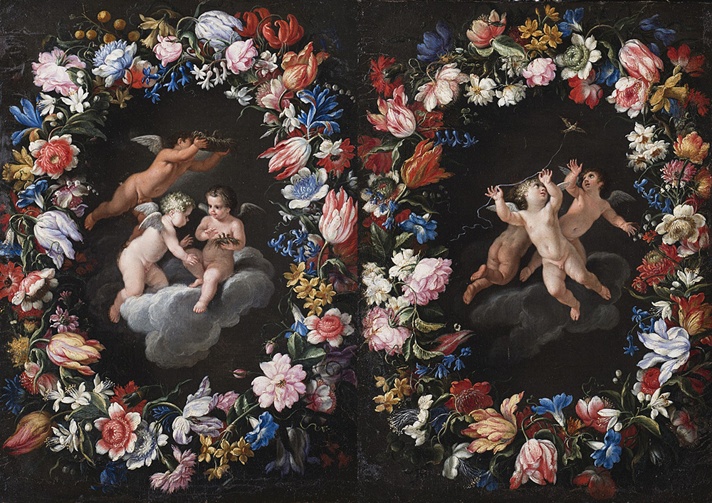 detto Mario dei Fiori (Attr.) "Ghirlande di fiori con amorini" coppia di...