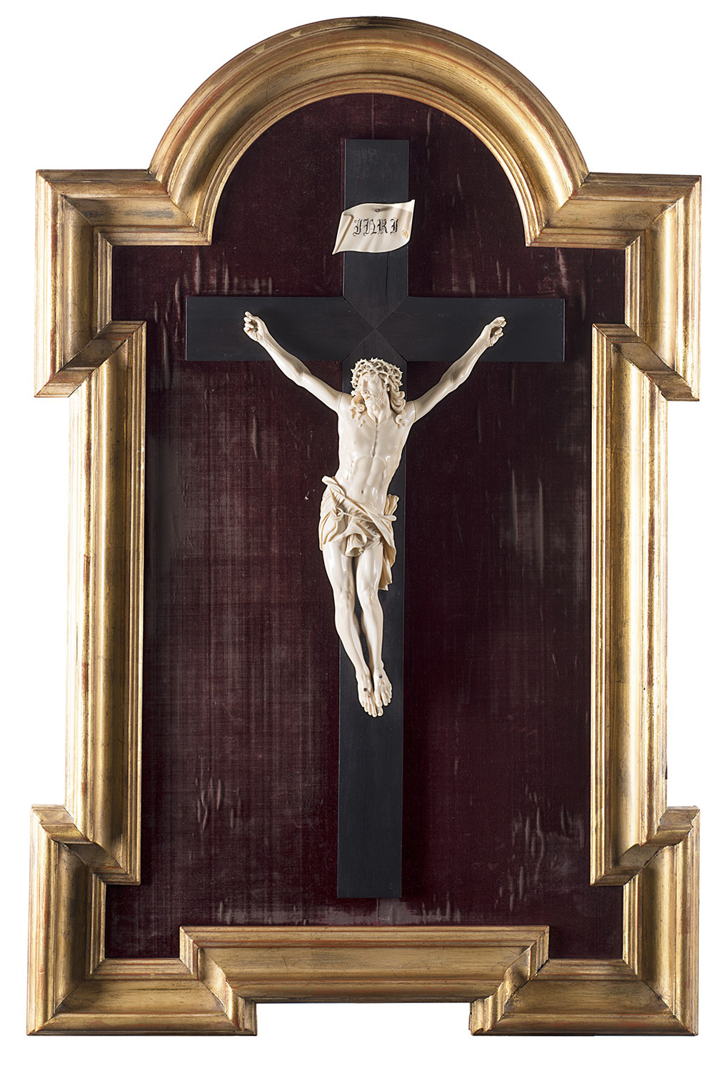 Maestro romano del sec. XVIII "Cristo crocifisso" scultura in avorio (h. cm 41) montato su croce in legno ebanizzata entro cornice sagomata di epoca posteriore su pannello in velluto. Siglato a inchiostro sul retro (lievi difetti e restauri) Roman master of the 18th century "Christ crucified" ivory sculpture on ebonised wood crucifix. Signed on verso (minor defects and restorations. Frame of a later date)