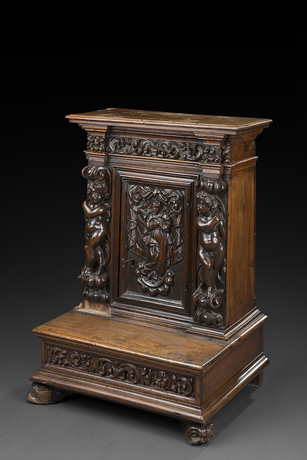 Inginocchiatoio in noce ad un cassetto laterale sottopiano, fronte con fasce intagliate a motivi vegetali e anta scolpita con raffigurazione dell'Assunzione della Vergine. Montanti scolpiti a figure di putti, piedi a delfino. Bergamo, sec. XVII (difetti e restauri) Walnut prie-dieu. Bergamo, 18th century (defects and restorations)