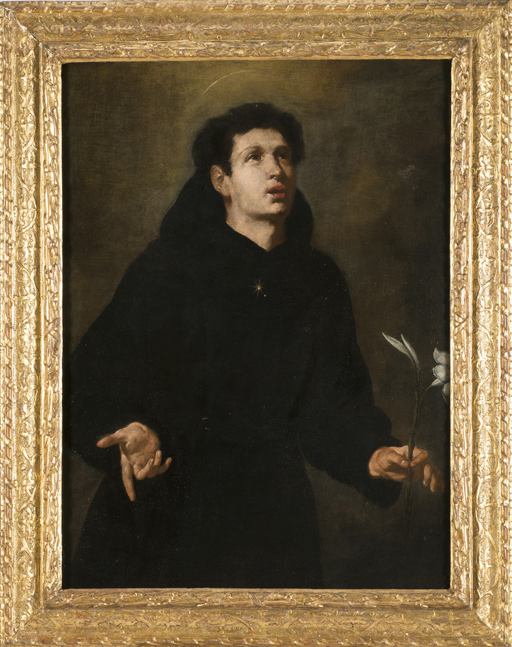 Scuola genovese del secolo XVII, cerchia di Bernardo Strozzi "S.Nicola da Tolentino" olio su tela (cm 100x70) In cornice dorata del secolo XVII 17th-century Genoese school, circle of Bernardo Strozzi " St. Nicholas of Tolentino", oil on canvas (cm 100x70) Antique frame