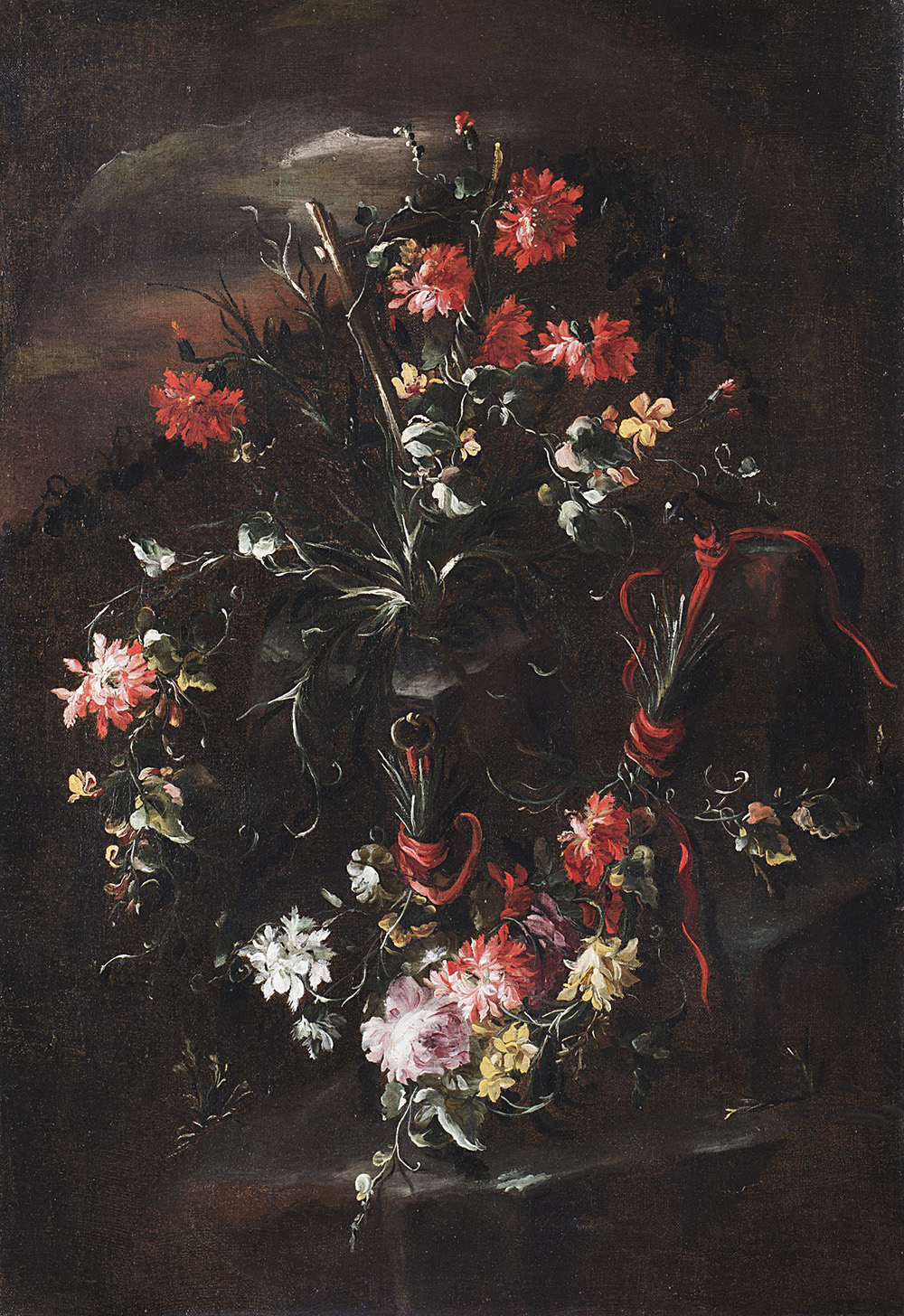 Maestro lombardo del secolo XVIII "Composizione floreale" olio su tela (cm 110x75) In cornice 18th-century Lombard master " Vase of Flowers." oil on canvas (cm 110x75) Framed (defects)