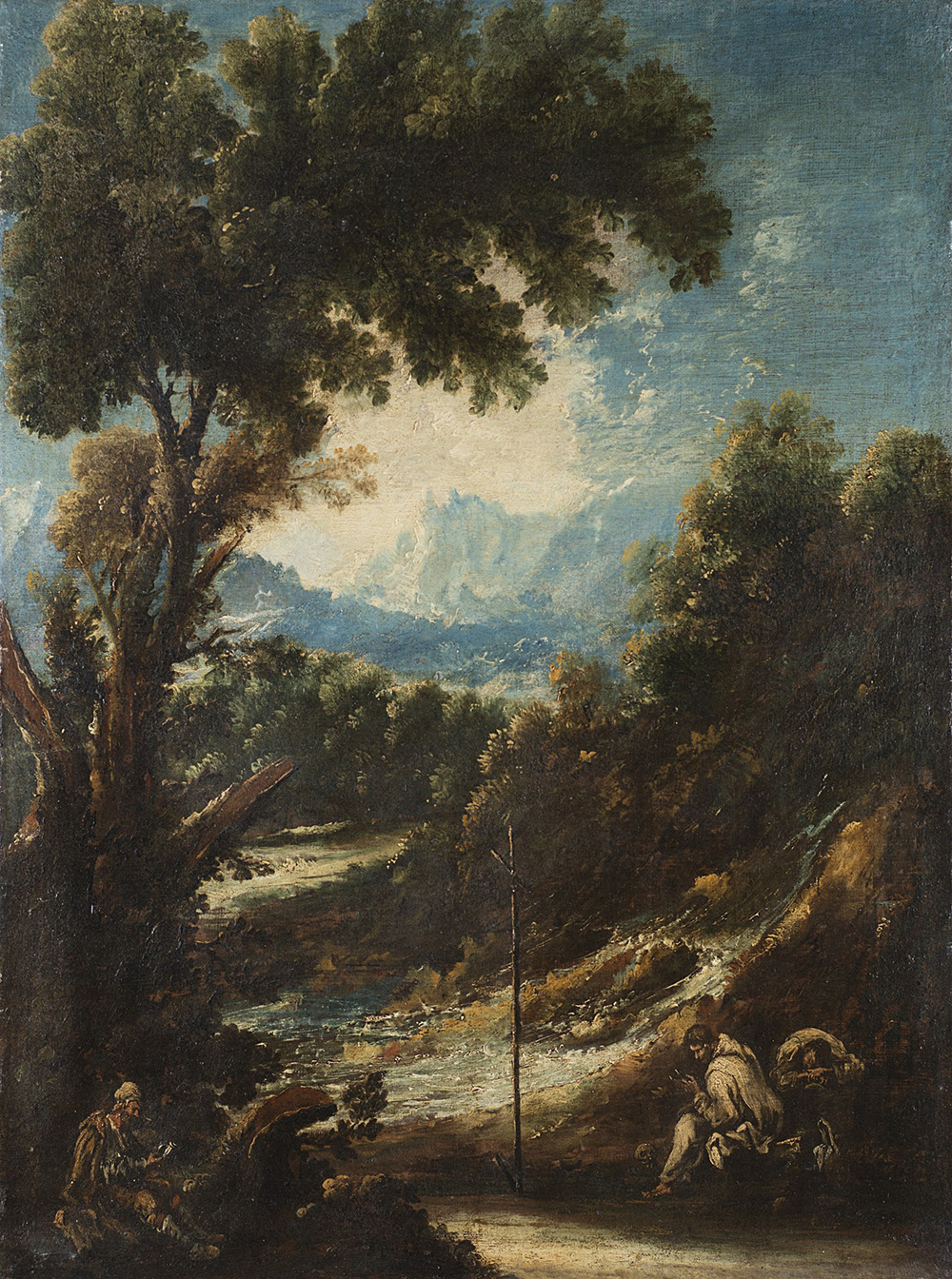 "Paesaggio alberato con eremiti" e "Paesaggio con pescatori di anguille" coppia di oli su tela (cm 98x73 ciascuno). Allegata expertise di Anna Orlando Two landscapes, oils on canvas (cm 98x73) Appended expertise by Anna Orlando