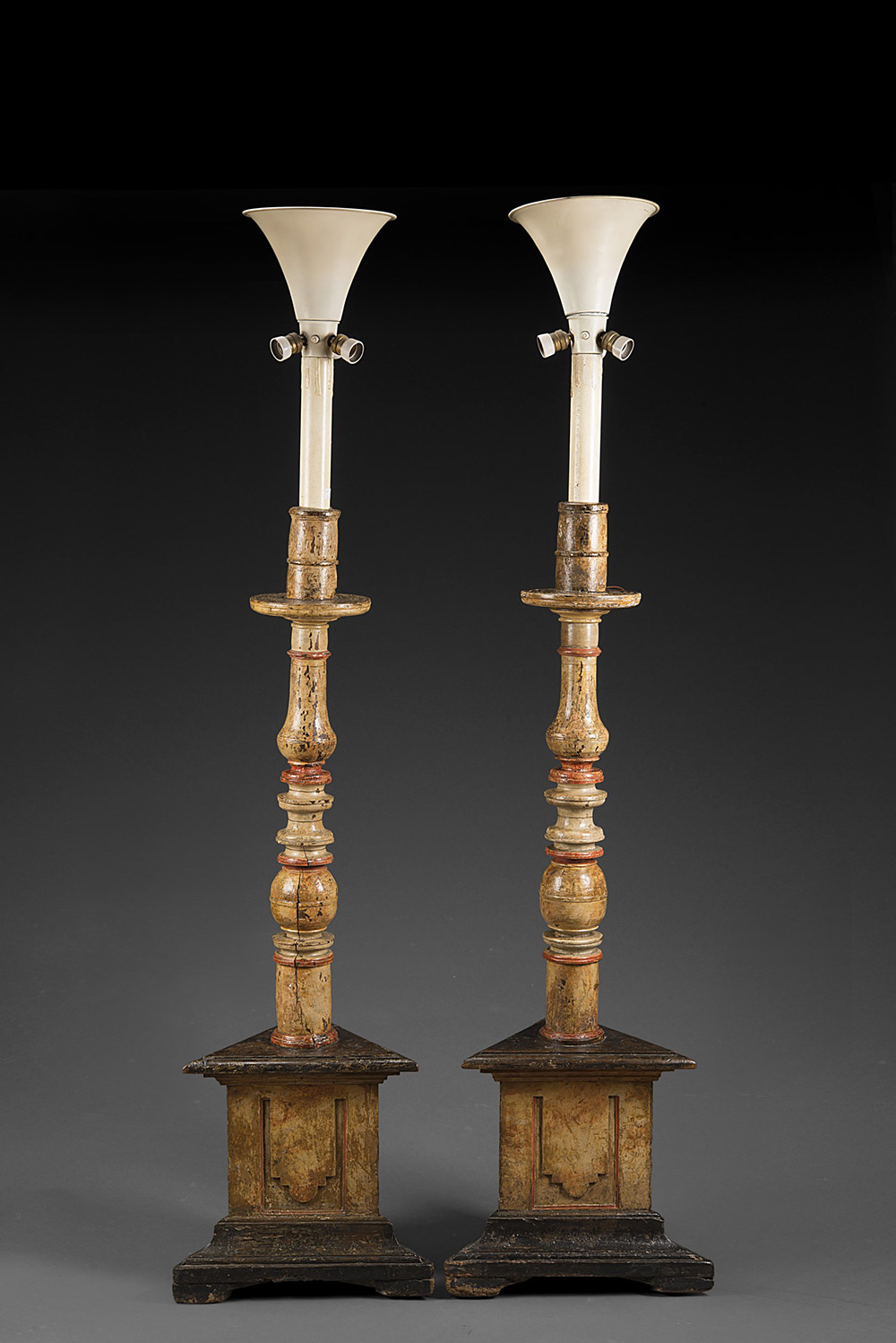 Coppia di torciere in legno laccato con corpo a colonna tornita poggiante su base triangolare (h. cm 148) Inizio sec. XVII (difetti e mancanze. Montate a luce elettrica in epoca posteriore) A pair of lacquered wood torchËres. Early 17th century (defects and losses, mounted as electric lights)