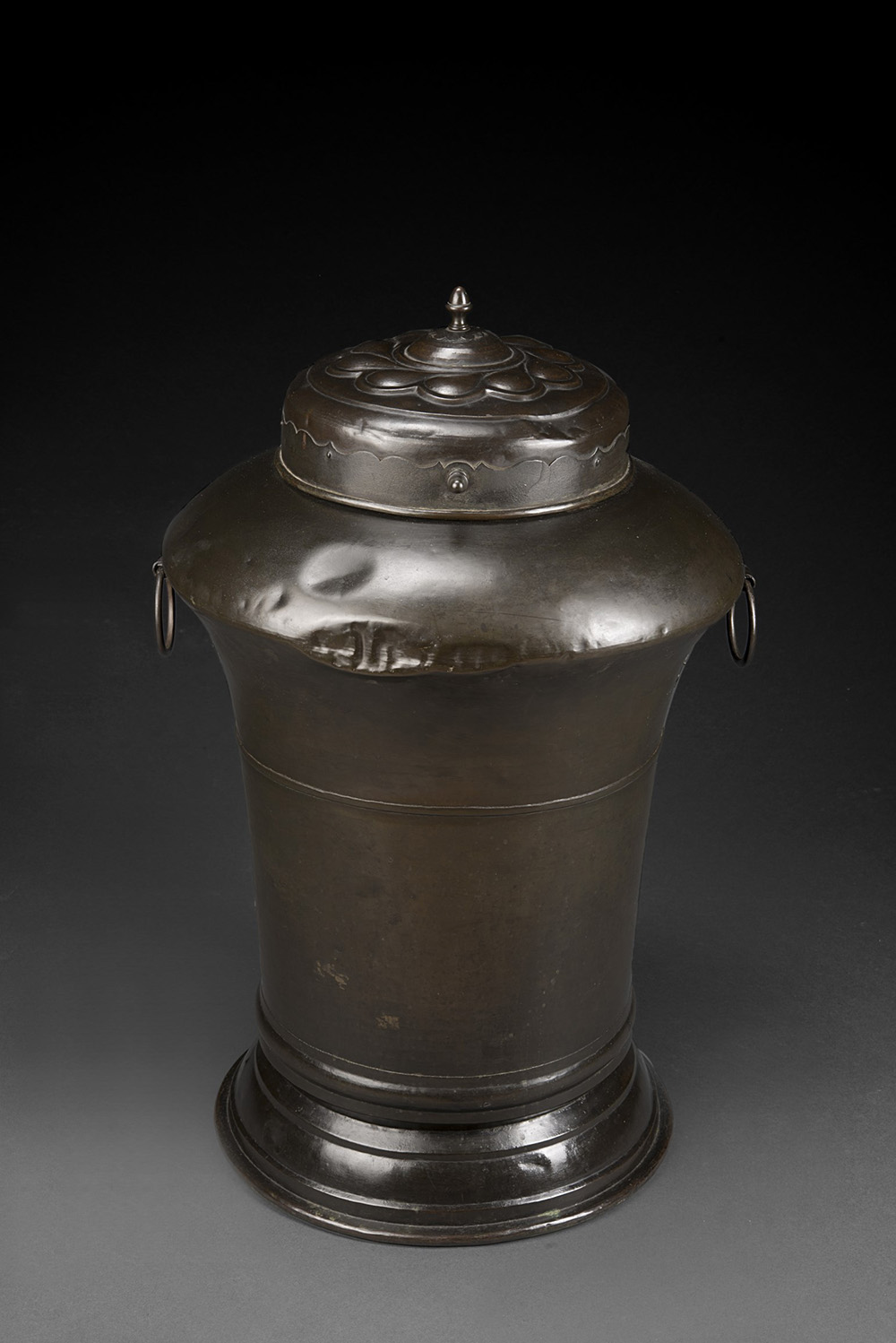 Antico contenitore biansato in rame con coperchio sbalzato a gocce stilizzate (h. cm 76) (difetti) Antique copper vessel (defects)