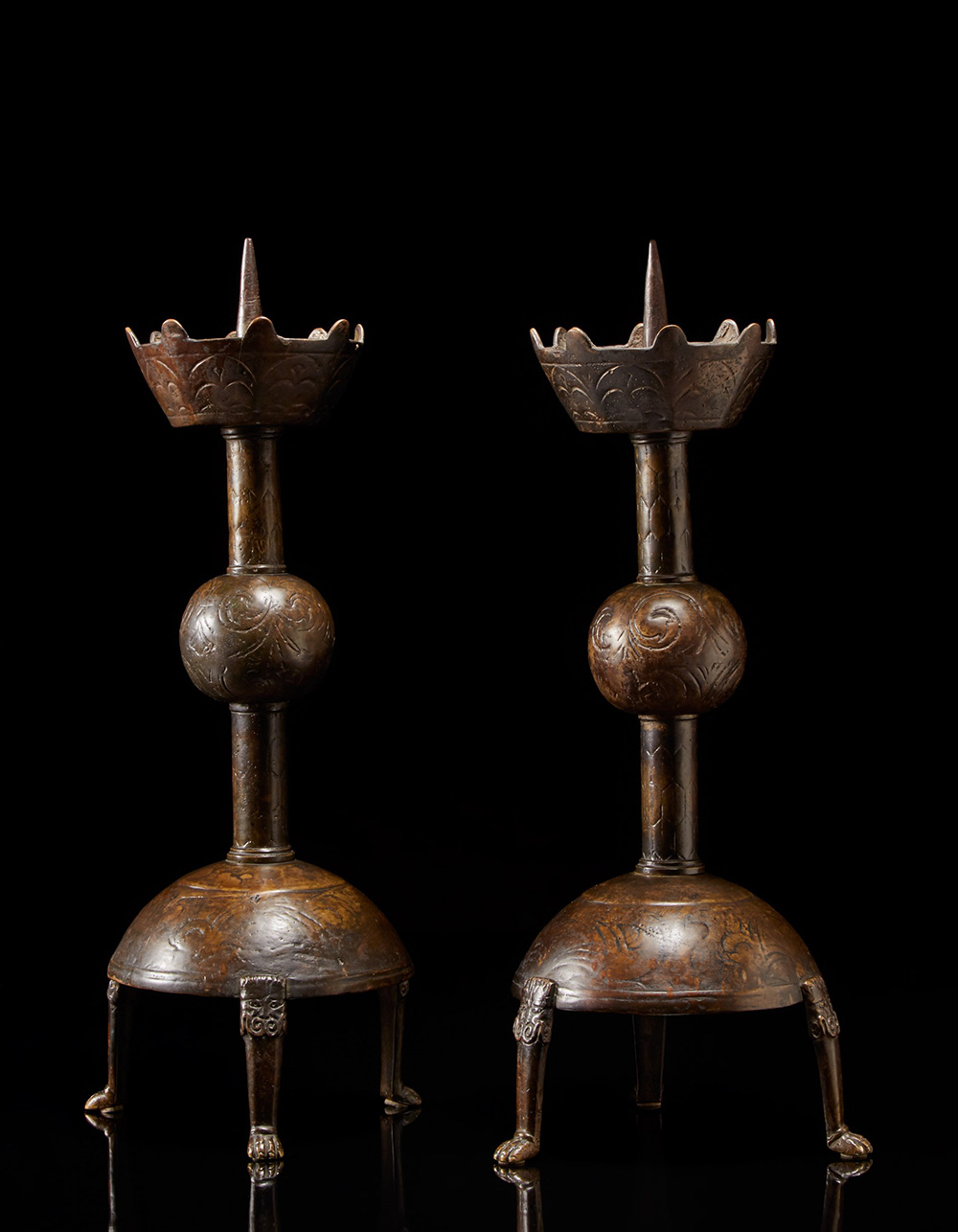 Coppia di antichi reggi cero in bronzo con fusto a boccia e decorato a volute fogliate e motivi geometrici. Base tonda sorretta da tre piedi con teste leonine e piedi ferini (h. cm 54) (difetti e restauri) A pair of antique bronze candle holders (defects and restorations)
