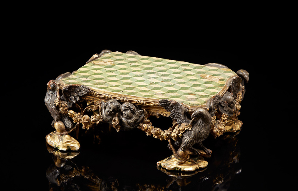 Base di forma sagomata con piano laccato a motivi geometrici sorretto da aquile a tutto tondo con ali spiegate unite da teste di cherubini con ghirlande floreali in legno laccato e dorato (cm31x10x25) Roma, sec. XVIII (difetti) 18th-century Roman base with lacquered top (defects)