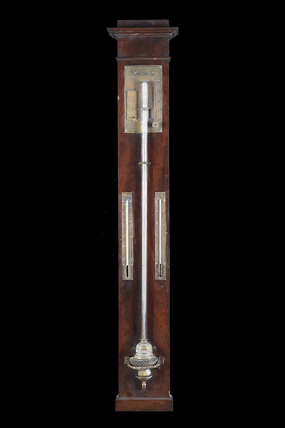 DURONI, MILANO Barometro ad ampolla in cristallo con cassa in mogano e applicazioni in ottone iscritto, con due termometri con quattro scale di lettura. Inizio sec. XIX (h. cm 115 ca.) (difetti, rotture e mancanze) Duroni, Milan. Mahogany stick barometer. Early 19th century (defects, breakage, and losses)