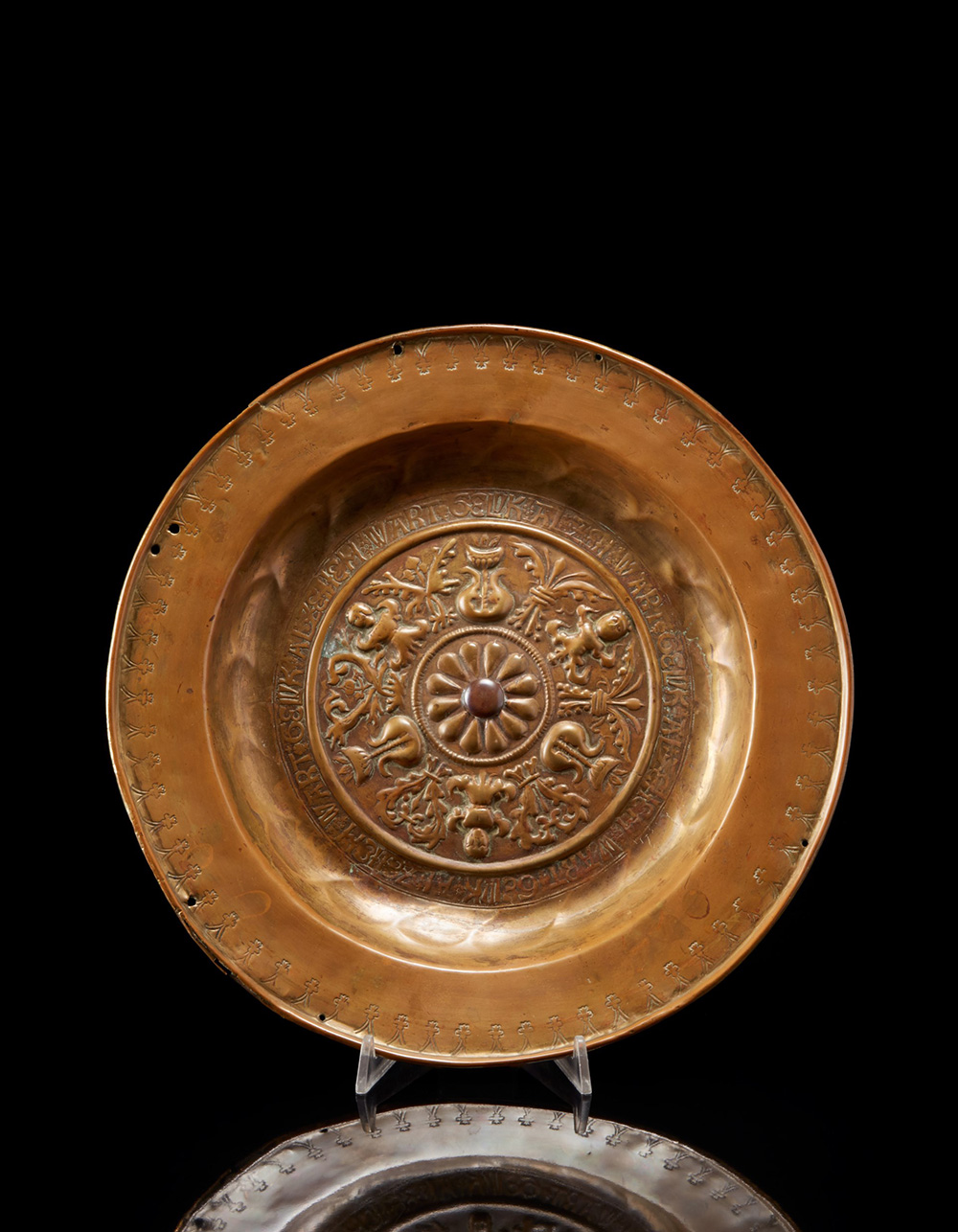 Elemosiniere in bronzo sbalzato decorato a figure fantastiche, volute e inscrizioni nel cavetto (d. cm 36) (difetti e restauri) Bronze alms bowl (defects and restorations)