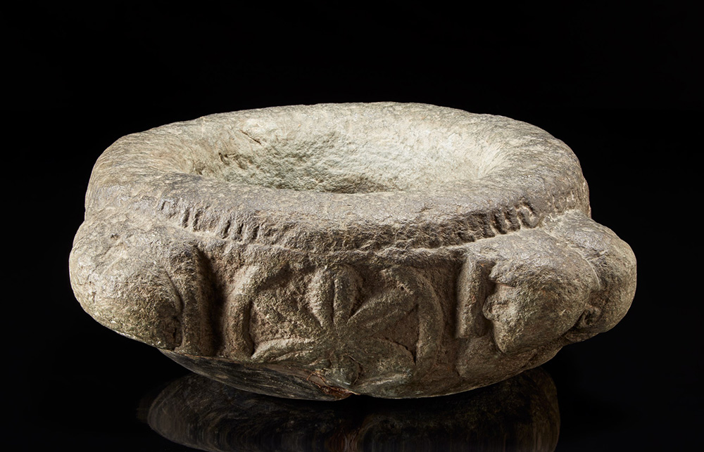 Acquasantiera quadrilobata in granito scolpito a figure e simboli religiosi. Sec. XV (d. cm 38) (mancanze) 17th-century granite holy water font (losses)