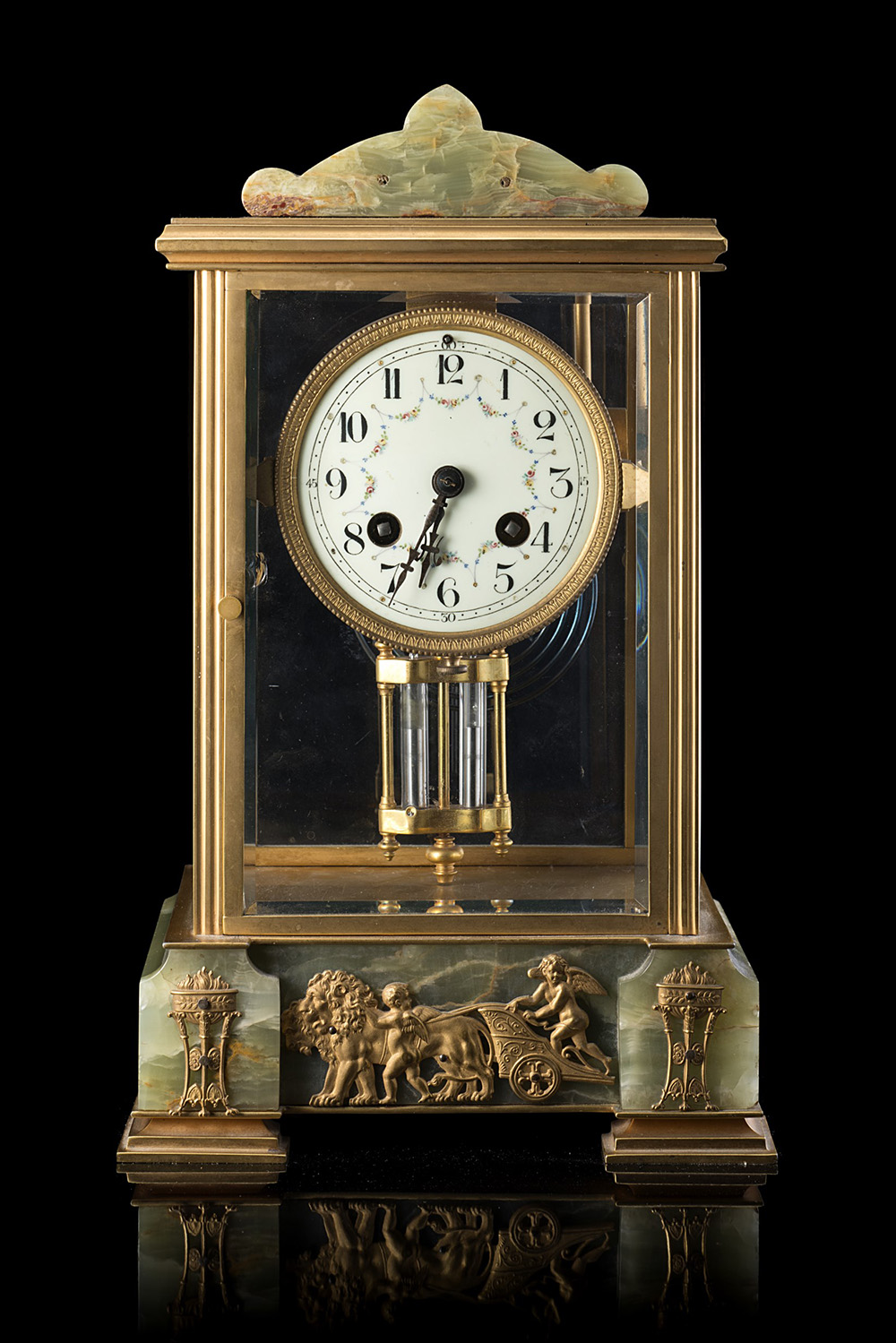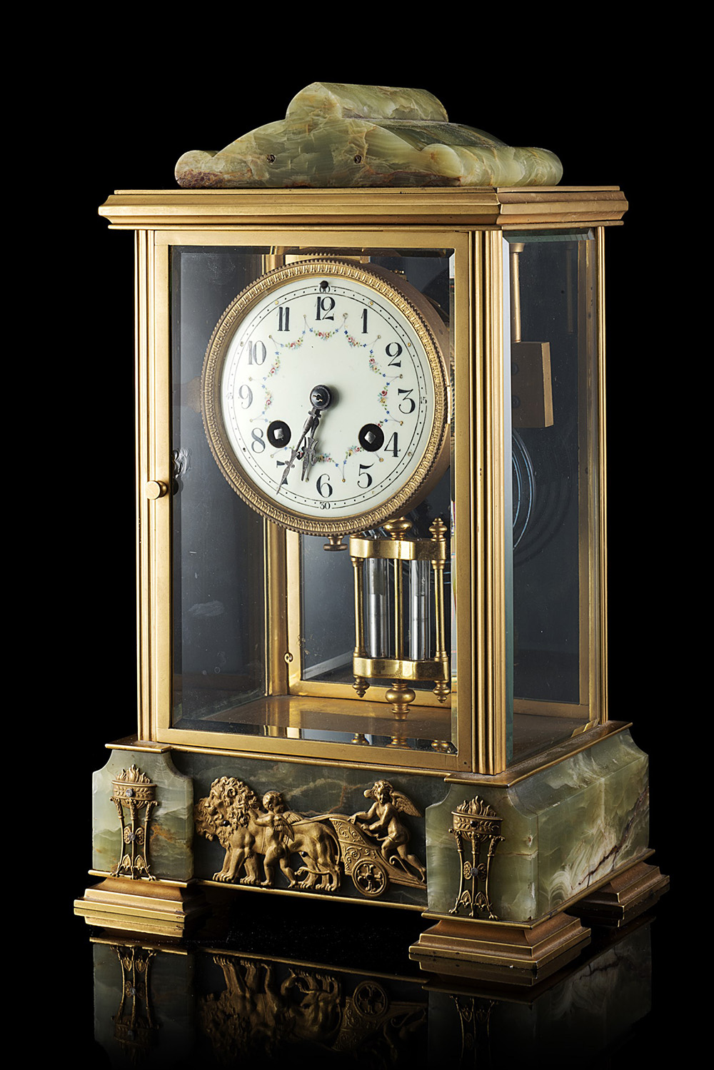 SAMUEL MARTI Orologio da camino a vetrinetta con cassa architettonica in bronzo e onice, decorato da fregi classici Epoca sec. XX Movimento firmato Quadrante in smalto bianco con cifre arabe e fiori policromi Movimento con carica settimanale, suoneria delle ore e delle mezze su gong, scappamento ad ancora (h cm 32) (difetti) Samuel Marti. 20th-century bronze and onyx mantle clock in glass case (defects)