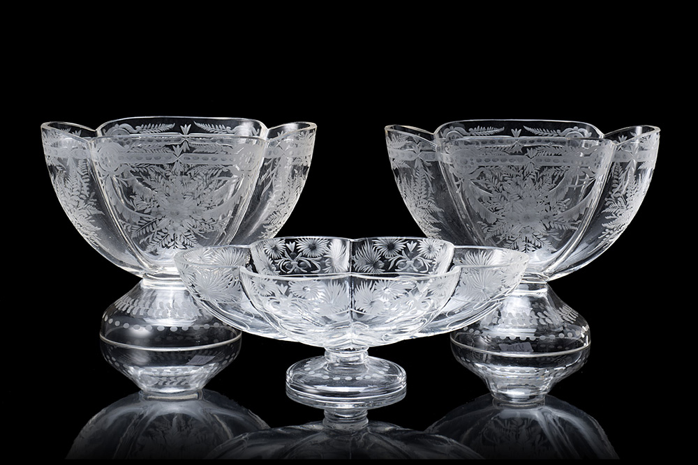 Gruppo di tre alzatine di forma sagomata in vetro inciso a fiori e volute. Inizio sec. XX Group of three early 20th-century tazzas