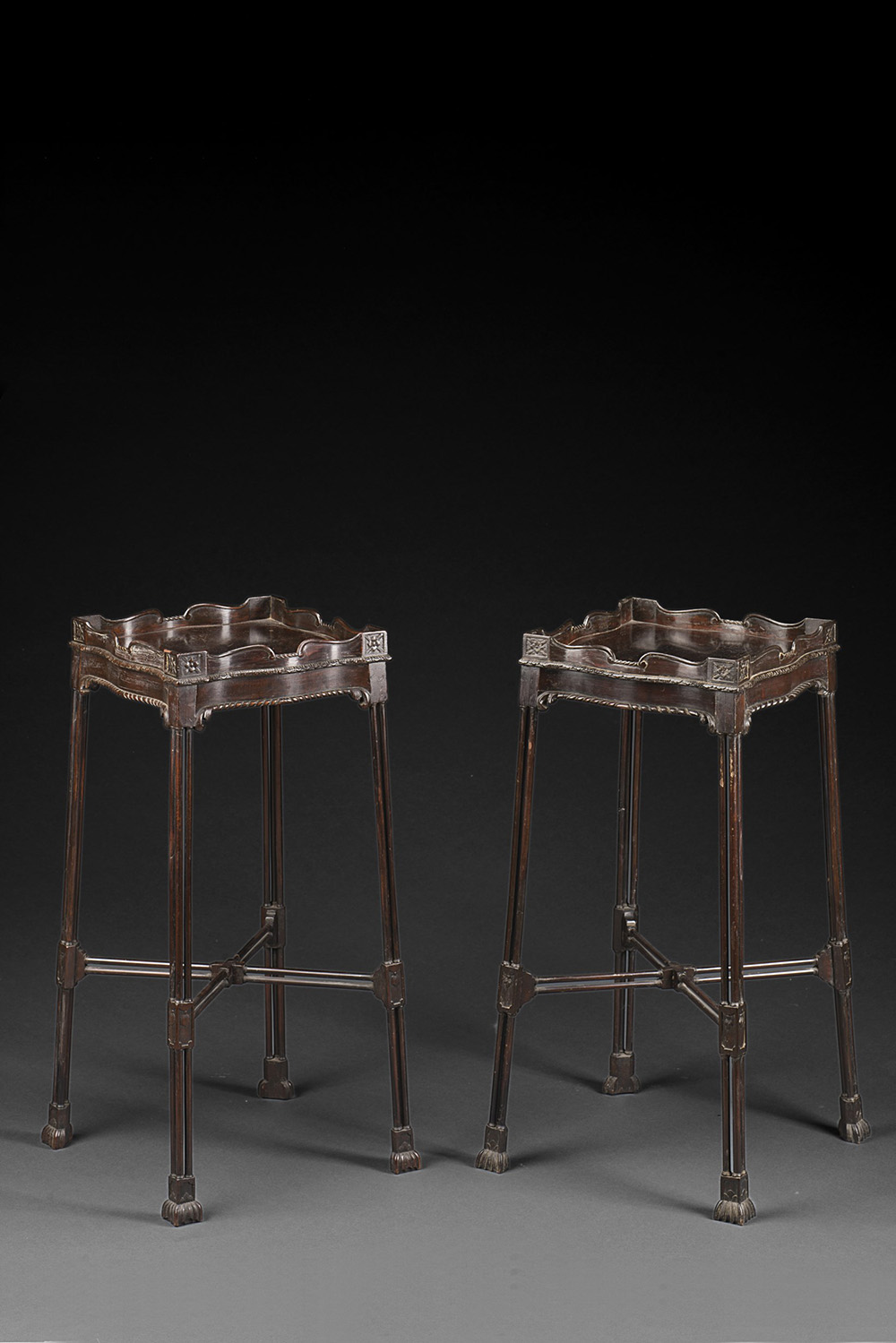 Coppia di gueridon in mogano con piano sagomato decorato da ringhiera intagliata a volute e fiori. Gambe e traverse a listelli con piedini a mensola. Inghilterra, sec. XIX (cm 33x73x33) A pair of mahogany guÈridons. England, 19th century