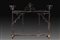 Alare in ferro battuto con montanti portavaso decorati a motivi stilizzati. Piedi a ricciolo. Sec. XVIII (cm 160x136) 18th-century andiron