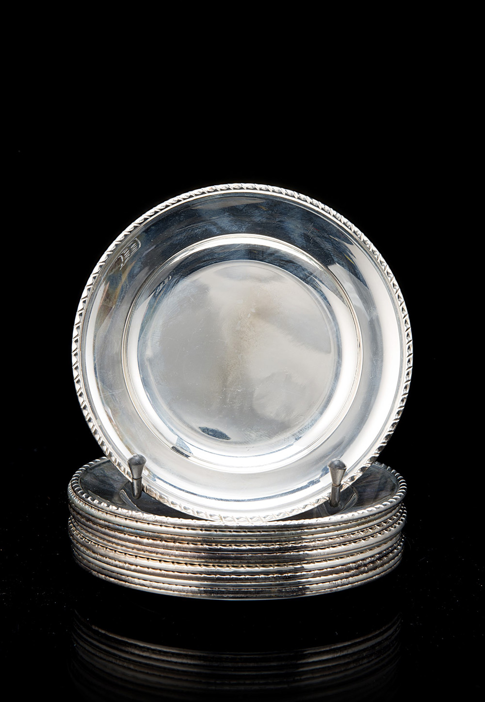 Dodici piattini in argento di forma circolare liscia con bordura San Marco. Italia, sec. XX (d. cm 15) (gr 1600 ca.) Twelve small silver plates. Italy, 20th century