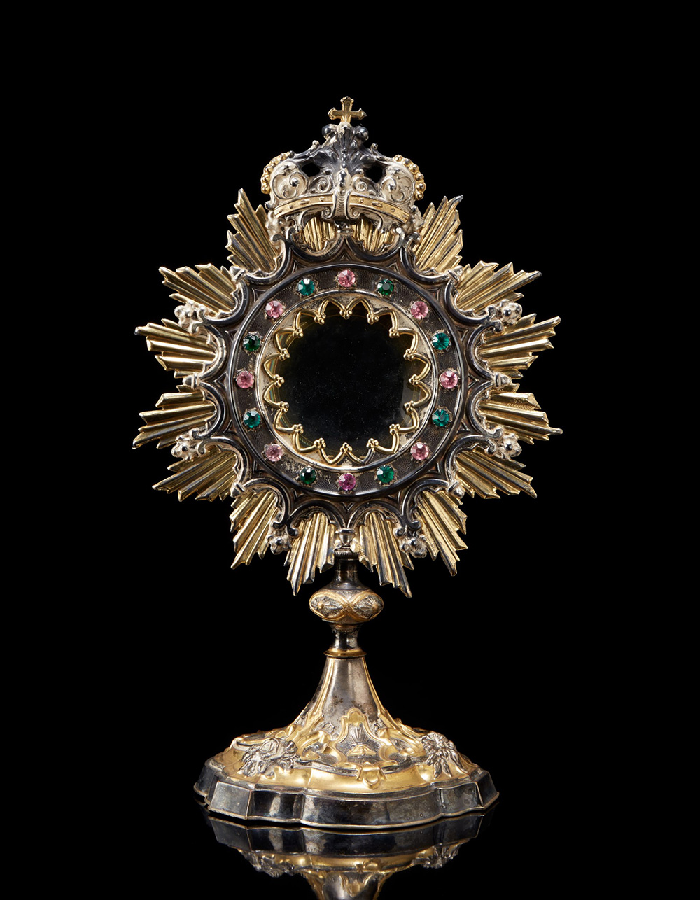 Ostensorio in metallo e argento parzialmente dorati. Piede gradinato e tripartito a specchiature sbalzate con simboli religiosi; nodo lenticolare a nastri intrecciati e fiori. Raggera sbalzata a rosoni con cornice di pietre in pasta vitrea colorata, sormontata da corona. Italia, fine sec. XIX (h. cm 33) (difetti e mancanze) Gilt silver and metal monstrance (defects and losses)