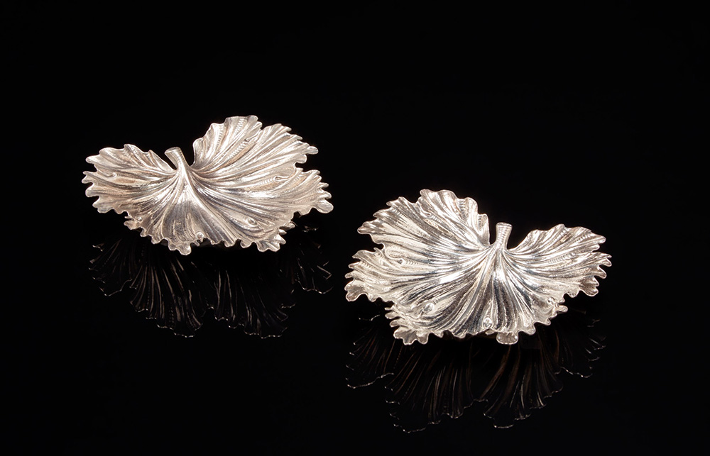 Gianmaria Buccellati. Due vaschette in argento a forma di foglia (l. cm 12) (gr 180 ca.) A pair of silver leaf-shaped bowls. Gianmaria Buccellati
