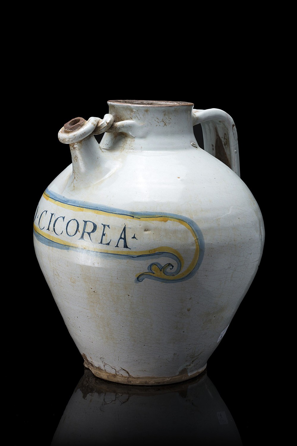 Grande orciolo in maiolica bianca compendiaria con cartiglio in giallo e azzurro con scritta in lettere capitali ëA. D. CICOREAí. Manico a nastro. Cannello versatore con reggetta (h. cm 31,5) Italia centrale, sec. XVII (rotture, sbeccature e cadute di smalto) Majolica chevrette. Central Italy, 17th century (breakage, chipping, and losses)