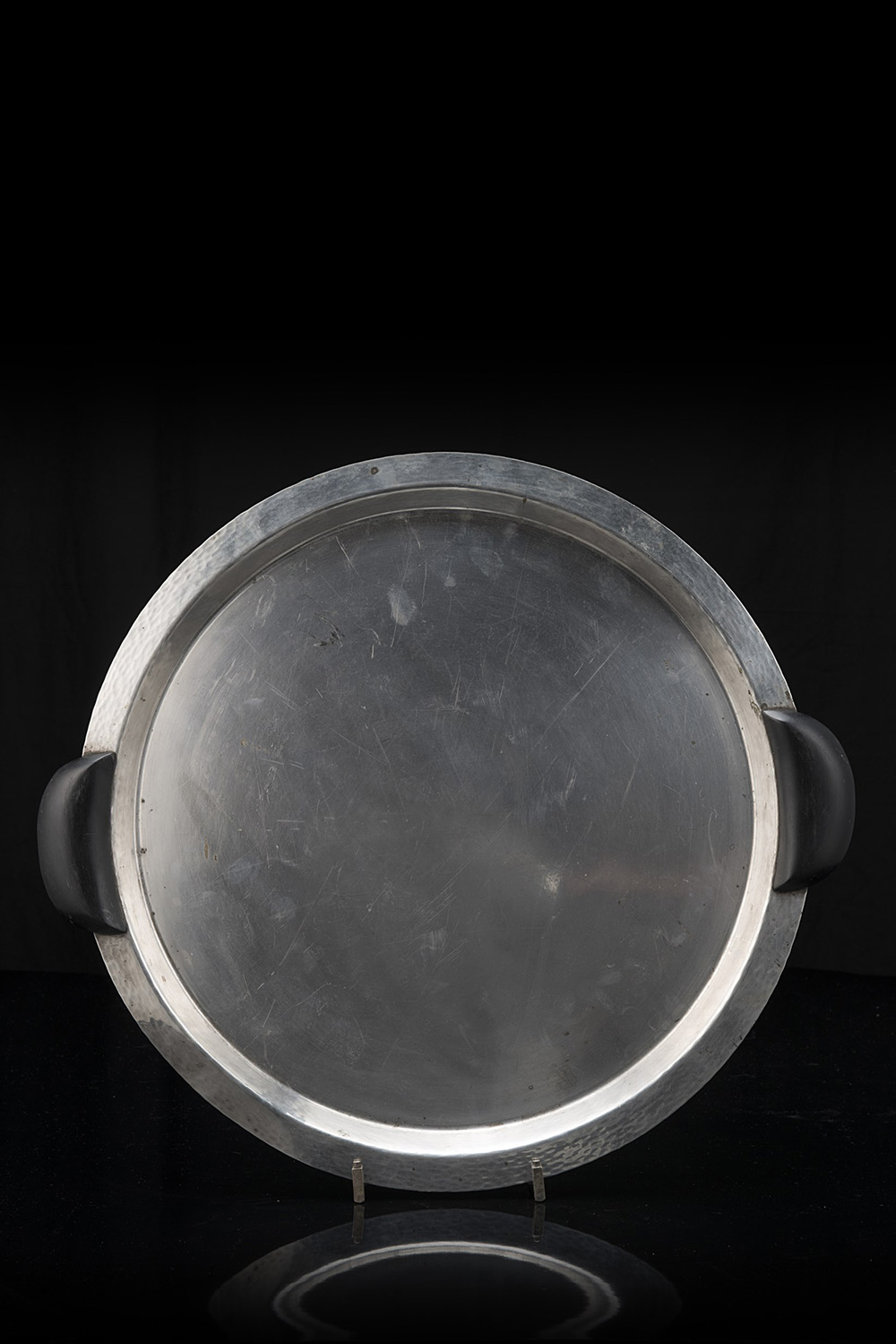 Vassoio di forma circolare in argento con tesa martellinata, fondo liscio e prese in legno ebanizzato. Italia, anni '20 (d. cm 44) (gr 1400 lordi) (difetti) Silver tray. Italy, 1920s (defects)