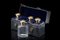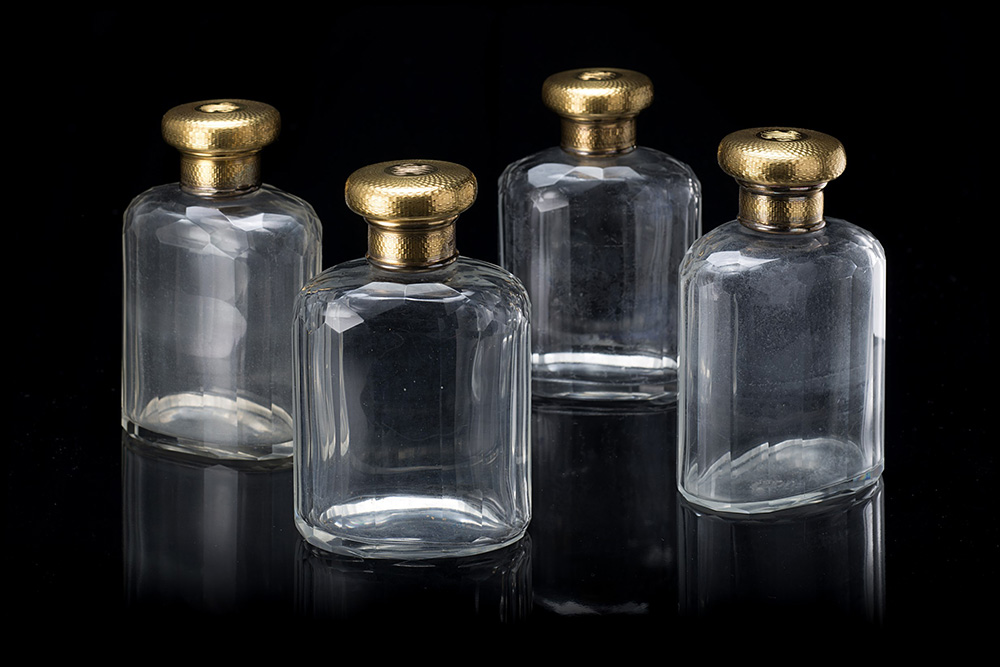 Servizio composto da quattro bottiglie portaprofumo in vetro sfaccettato e tappi in argento dorato lavorato a guillochË e inciso con monogramma. In custodia. Argentiere Asprey&Co. Londra, 1911 (h. cm 12) Set of four glass perfume bottles with silver-gilt caps. Asprey&Co Silversmiths. London, 1911