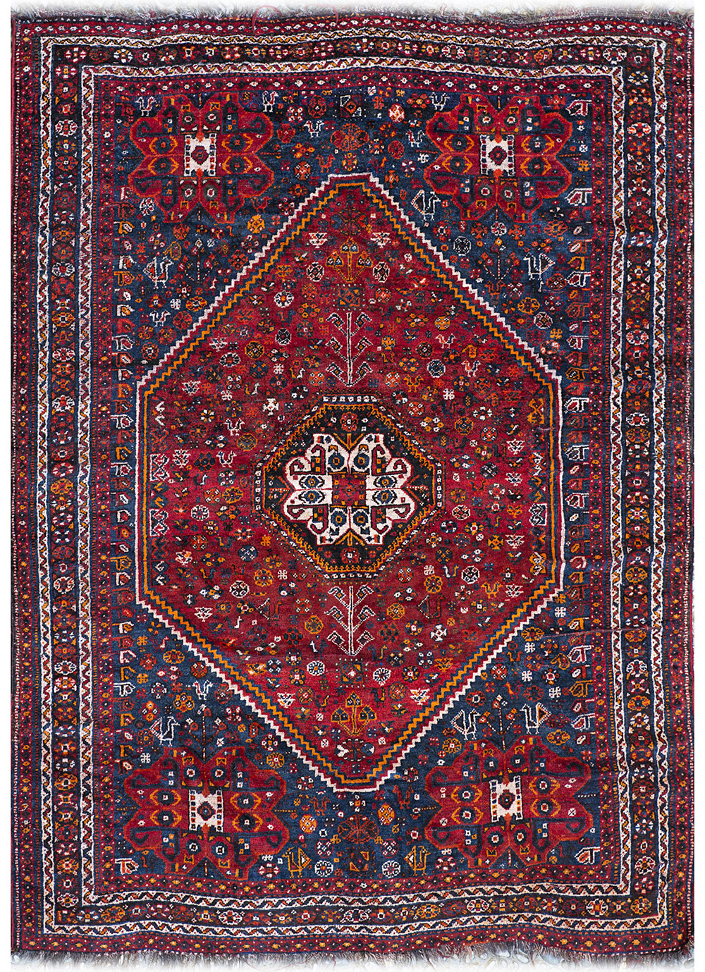 Tappeto Shiraz, Persia del Sud, prima met‡ del secolo XX Disegno a medaglione fondo rosso su campo fondo blu, motivi stilizzati floreali ed animali (cm 287x210) (difetti) Shiraz Carpet, Southern Persia, first half of the 20th century (defetcs)