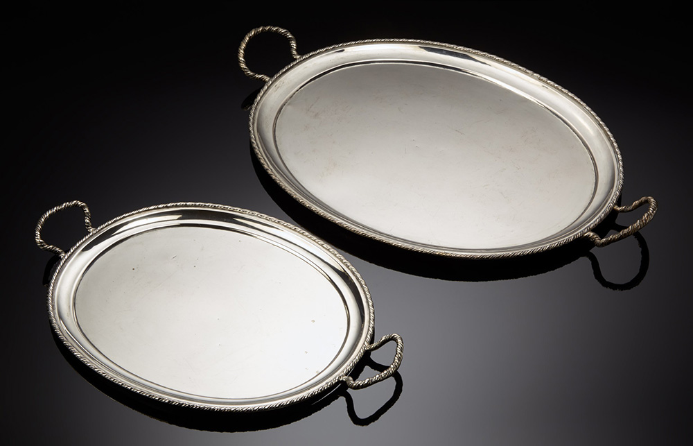 Lotto composto da due vassoi biansati ovali in argento in stile San Marco. Vicenza, inizio sec. XX. Marcati "Faggi" (cm 55x36; cm 43x28) (gr 2100 ca.) (difetti) Lot comprising two oval silver trays. Vicenza. Early 20th century (defects)