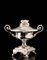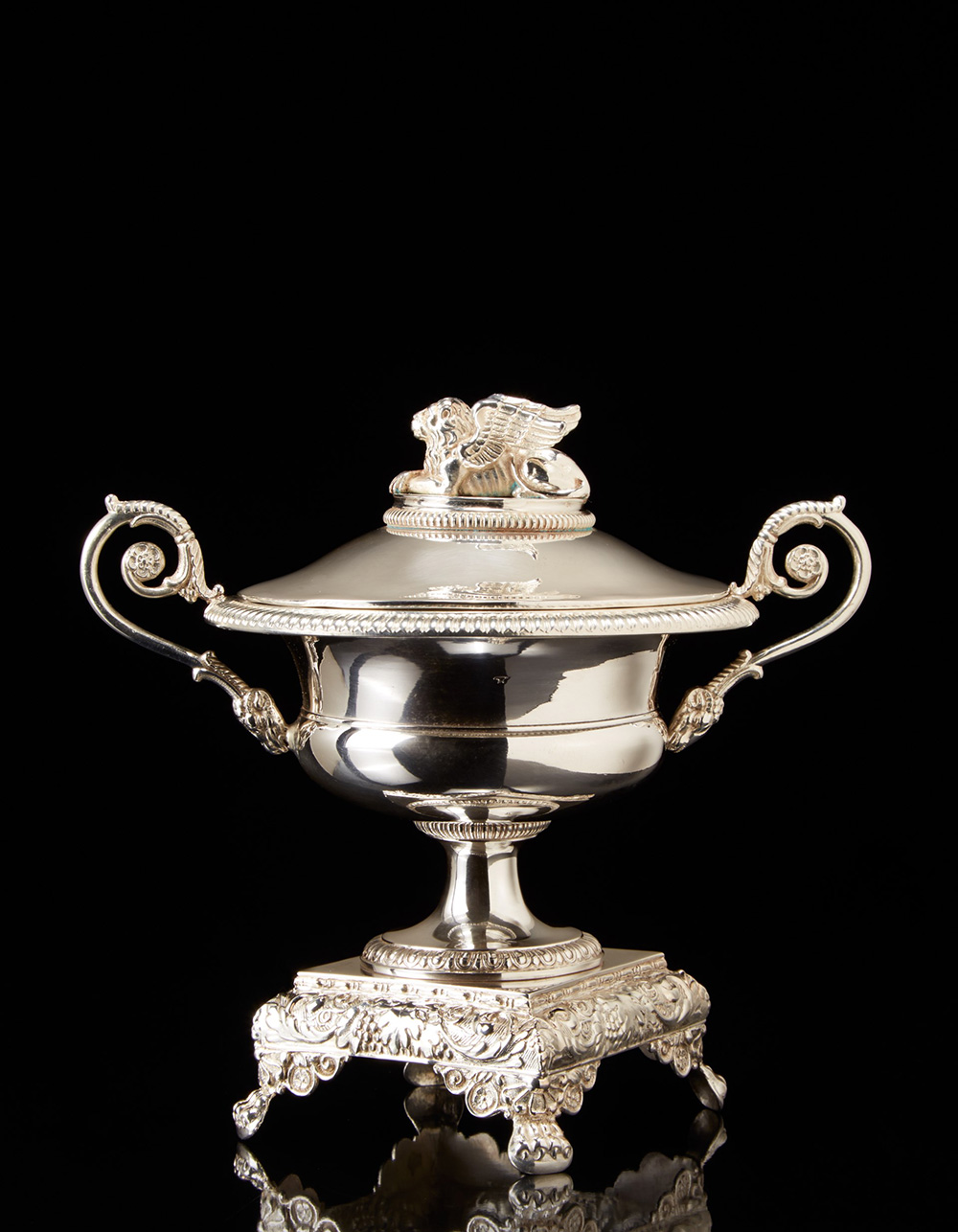 Zuccheriera in argento con corpo a cratere e coperchio lisci con bordi godronati. Base quadrata decorata a tralci d'uva sorretta da piedi ferini. Manici a girali fogliati e teste d'ariete. Presa in figura di leone alato. Regno Lombardo/Veneto sec. XIX (h. cm 16) (gr 350 ca.) (lievi difetti) Silver sugar bowl. Lombardo-Veneto Reign, 19th century (minor defects)