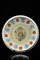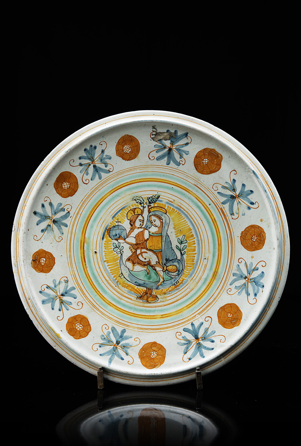 Alzata tonda con piccolo piede in maiolica policroma. Profilo liscio con bordo rilevato. Al centro del cavetto Ë raffigurata in blu e giallo la Madonna con Bambino che regge il globo con Croce e palme di martirio. Il bordo interno Ë caratterizzato da anelli concentrici in verde e giallo. Lungo il bordo decoro a ghirlanda geometrica a stilizzazioni in giallo e blu con profili in bruno. Italia centrale, sec. XVII (d. cm 32 x h. cm 6) (difetti) Polychrome majolica tazza. Central Italy, 17th century (defects)