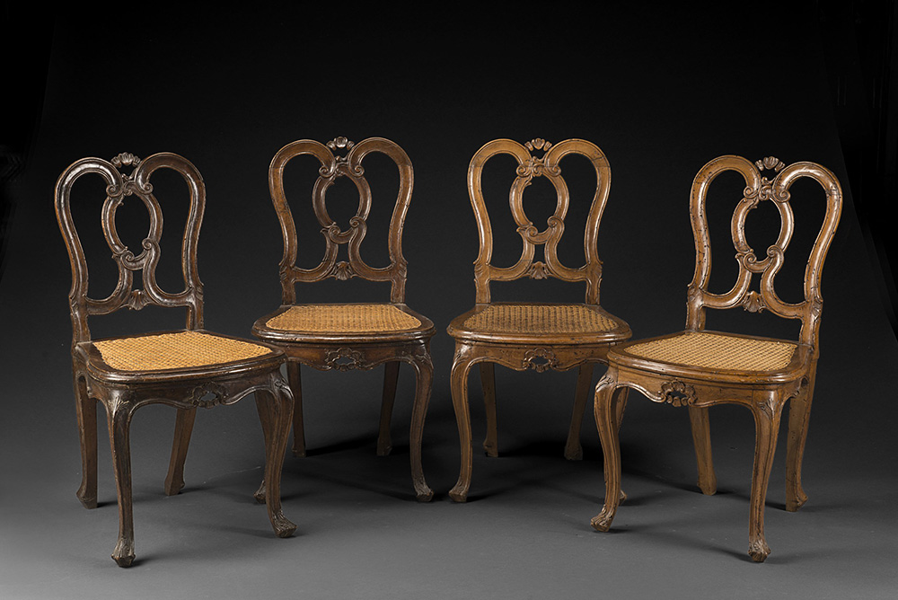 Gruppo di quattro sedie in noce con schienale a cartelle traforate e intagliate a volute e riccioli. Fascia decorata a motivi vegetali. Sedute incanucciate, gambe mosse. Veneto, sec. XVIII (difetti e restauri) Group of four 18th-century Venetian walnut chairs (defects and restorations)