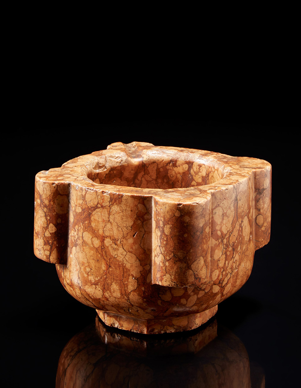 Mortaio quadrilobato in marmo di Verona poggiante su base ottagonale (h. cm 13) Sec. XVII 17th-century marble mortar
