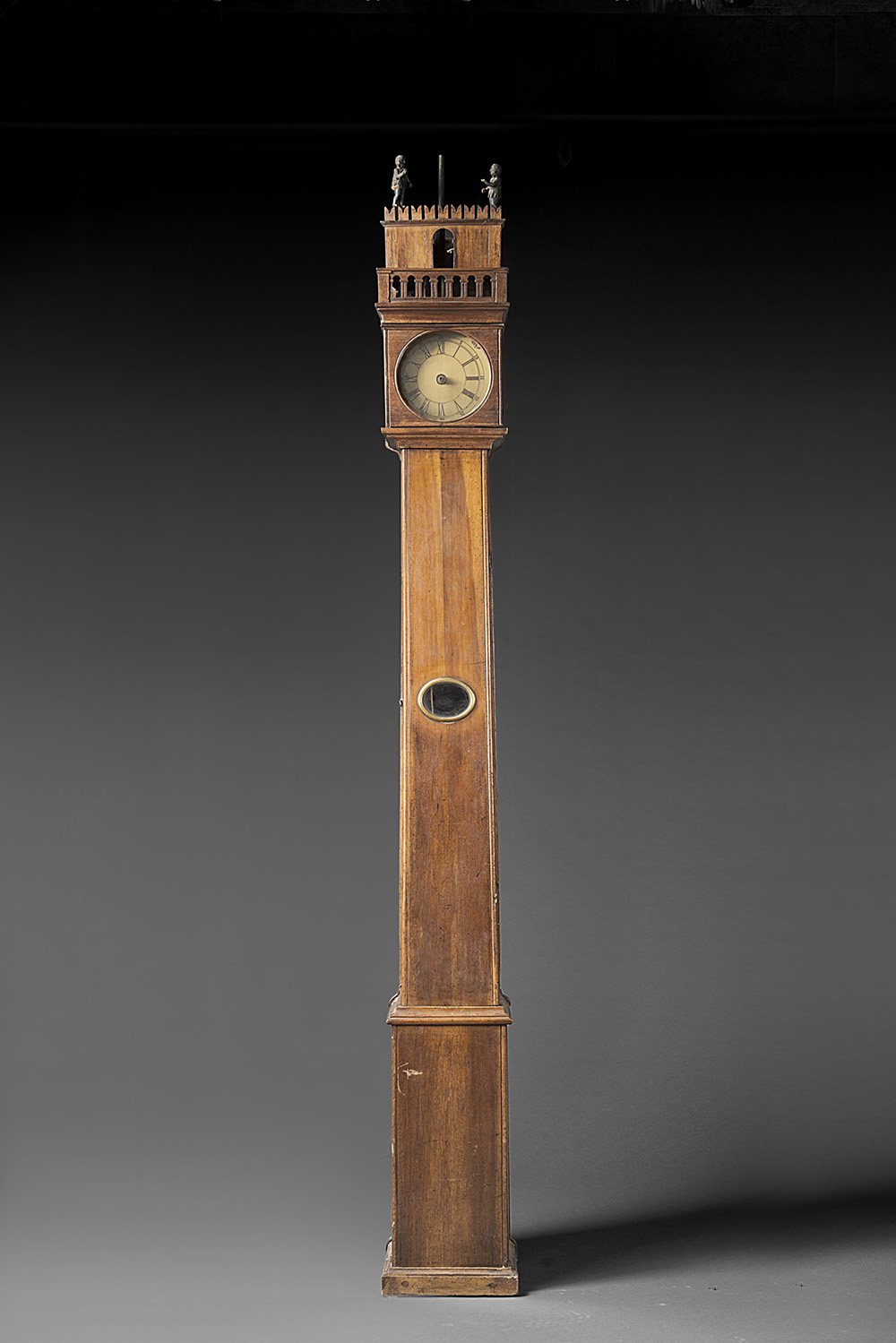 ANONIMO Orologio a colonna in noce Epoca fine sec. XVIII Movimento con suoneria delle ore e dei quarti comprendente due automi che battono su due campane poste sulla sommit‡ Quadrante in ottone inciso con fasce orarie con numeri romani e quatro fregi a fiore sugli angoli (h. cm 282) (quadrante e cassa non pertinenti, movimento scompleto) Unknown. Walnut clock. Late 18th century (replacements and losses)
