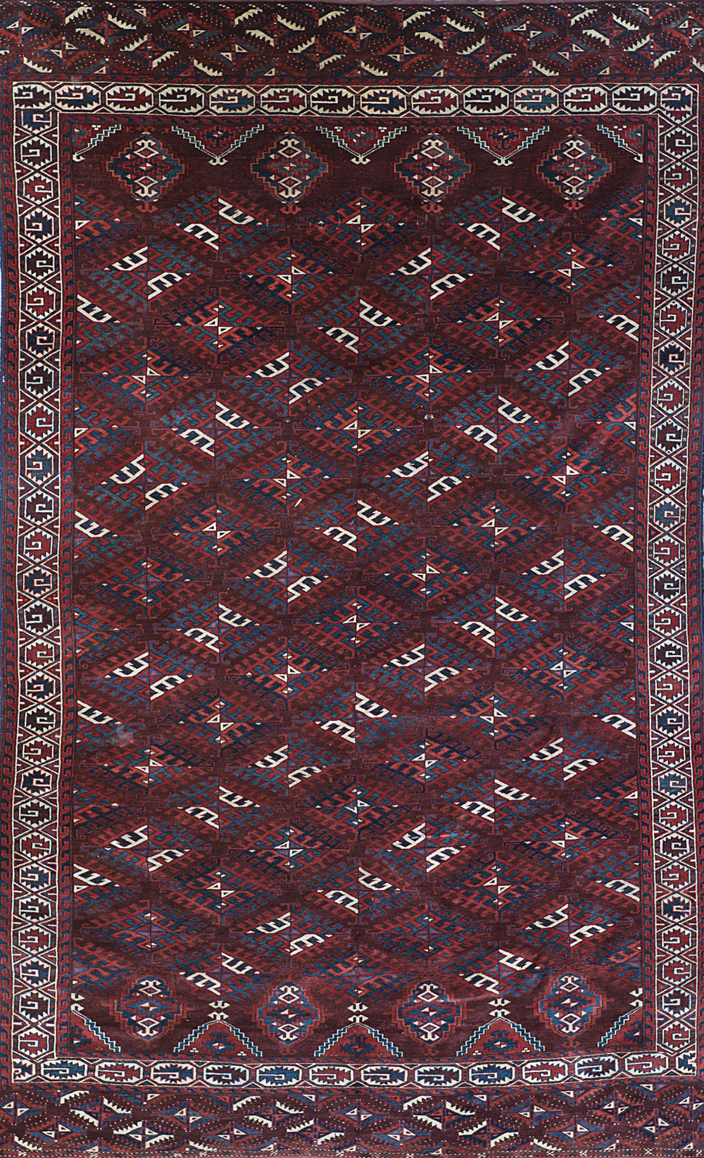 Tappeto Yomut, Turkestan Occidentale, fine secolo XIX Disegno a GUL nei toni del rosa, verde, bianco su fondo color bordeaux (cm 325x194) (difetti) Yomut carpet, Western Turkestan, late 19th century (defects)