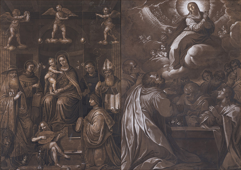 Scuola del sec. XIX, coppia di disegni da B. Luini raffiguranti scene religiose, tecniche miste (cm 54x37), in cornici 19th-century school, religious scenes, drawings from B. Luini, mixed media (cm 54x37) Framed