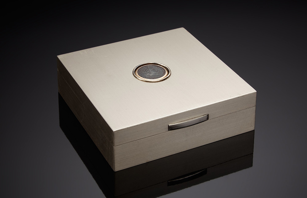 Scatola in argento di forma quadrata con superficie zigrinata e coperchio centrato da moneta dell'Impero Romano incastonata (all'interno etichetta: Impero Romano Massimiliano II -DAZA 305-313 Follis); interno in legno. Marcata Bulgari, 1975, titolo 925/1000 (cm 11x11; h. cm 3) (gr lordi 500 ca.) (lievi difetti) Silver box. Bulgari, 1975 (minor defects)
