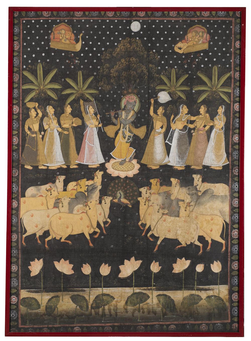 Dipinto policromo raffigurante divinit‡ indiana con flauto, accompagnata da figure femminili e animali sotto un cielo stellato, colore su tela, con cornice. India, inizio sec. XX (difetti) A painting depicting a deity with a flute accompanied by female attendants and animals beneath a starred sky, colours on cloth, framed. India, early 20th century (cm 168x120) (flaws)