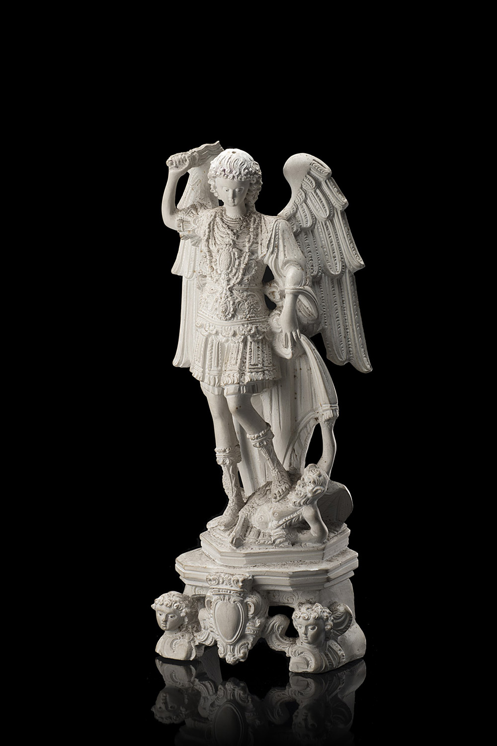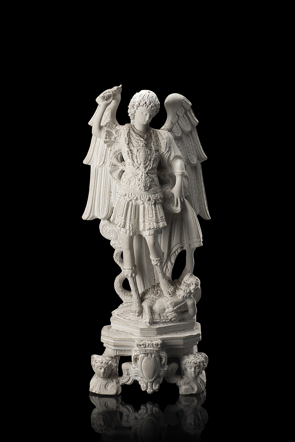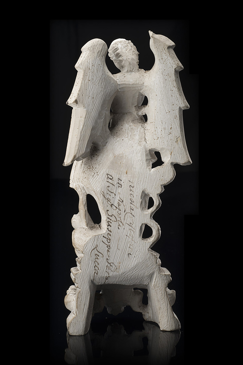 Manifattura di Napoli "San Michele" figura in scagliola. Inizio sec. XIX. Firmata e dedicata sul retro (difetti) Naples manufacture "San Michele" scagliola sculpture. Early 19th century. Signed (defects)