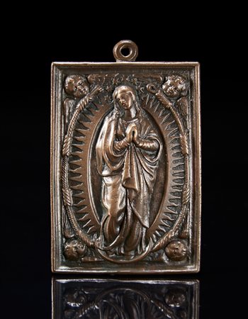 Arte del sec. XVI "Madonna della Mandorla" placca in bronzo sormontata da anello (cm 8,6x5,6) 16th-century art "Madonna della Mandorla" bronze plaque