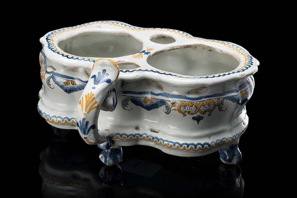 Porta olio e aceto sagomato e costolato in maiolica policroma con bordi a pizzetto e decori a ghirlanda vegetale in blu e giallo. Manico a voluta. Quattro piedini a zampa di leone in blu (h. cm 9 x 18 x 21) Veneto, fine sec. XVIII (sbeccature e filature. Mancante delle due bottiglie) Late 18th-century Venetian majolica cruet (bottles missing and chipping)
