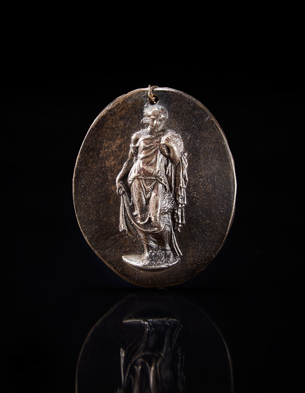 Medaglia di forma ovale decorata in altorilievo con figura di Vestale (cm 6,8x5,2) Sec. XVIII (difetti) 18th-century high relief medallion depicting a Vestal (defects)