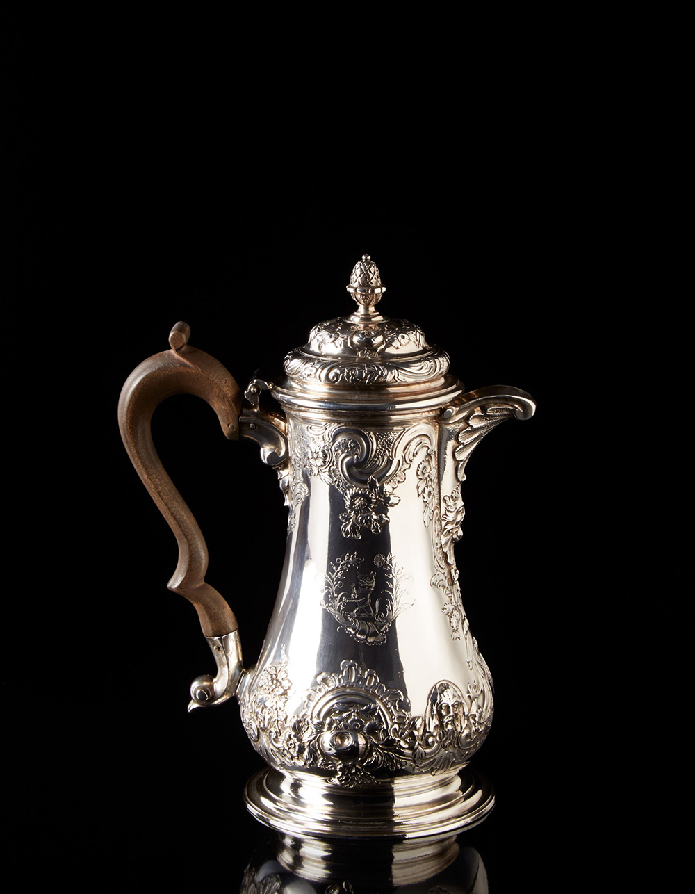 Caffettiera in argento con corpo a balaustro e coperchio a doppia bombatura con presa a pigna, decorati con fasce sbalzate a volute, motivi floreali e volti allegorici delle quattro stagioni, versatoio a mensola con frange zigrinate e mascherone. Manico in legno a doppia voluta. Argentiere Thomas Whipham. Londra, 1752 (h. cm 23,5) (gr 860 ca.) Silver coffee pot. Thomas Whipham Silversmith. London, 1752