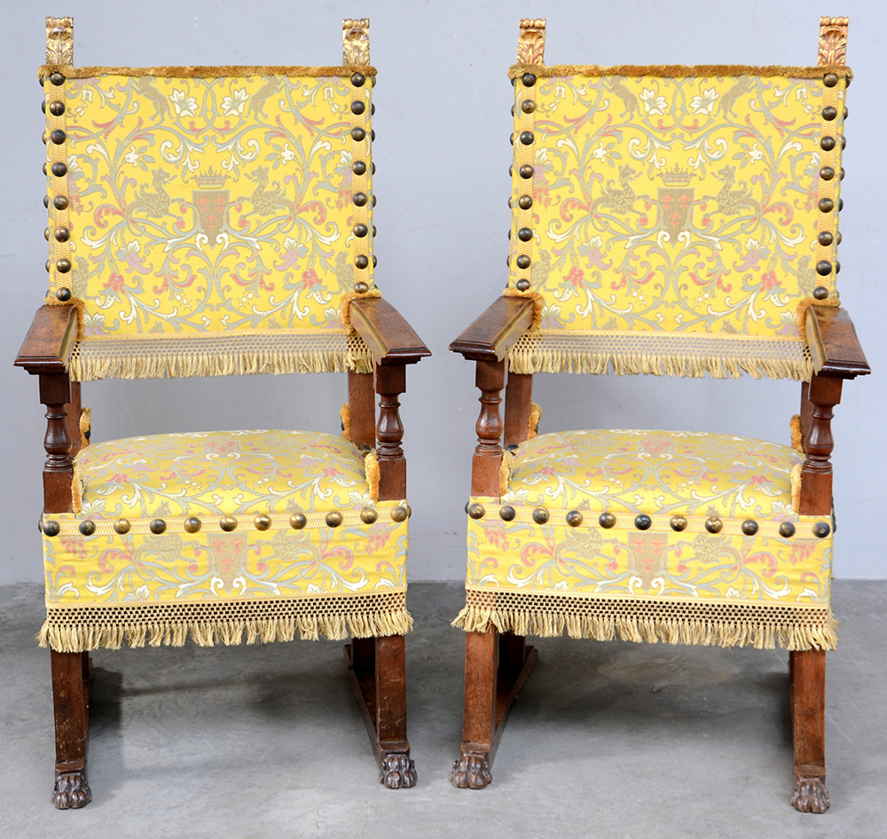 Coppia di poltrone in noce con braccioli e gambe dritte. Schienale decorato con pinnacoli intarsiati e dorati. Piedi anteriori ferini. Sec. XVII (difetti) Pair of 17th-century walnut wood armchairs (defects)