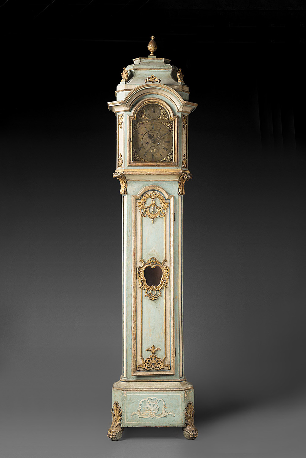 JOHN BATES BRUXELLES Orologio a colonna in legno laccato e dorato. Epoca met‡ XVIII secolo Movimento con carica a otto giorni, scappamento ad ancora, suoneria delle ore e delle mezze, data Quadrante in metallo con fascia oraria con numeri romani, quadrantino per "sonne" e "silence" (h. cm 280 ca.)(lacca di epoca posteriore) John Bates Brussels Lacquered giltwood clock. Mid-18th century (lacquer of a later date)