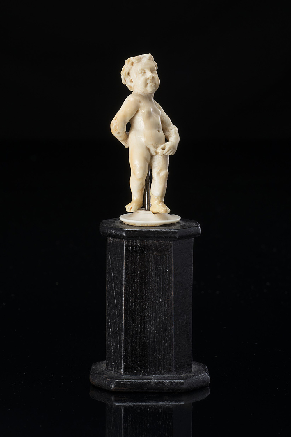 Scultore olandese del sec. XVII "Manneken Pis" gruppo in avorio (h. cm 5,6) Poggiante su base esagonale in legno ebanizzato 17th-century Dutch sculptor "Manneken Pis" ivory sculpture