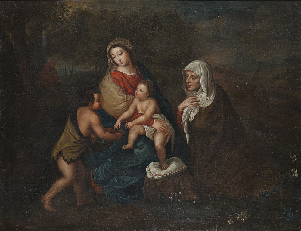 Scuola del secolo XVII "Madonna con Bambino, S. Giovannino e S. Anna" olio tu...