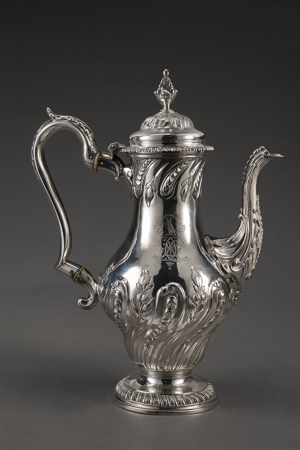 Caffettiera in argento con corpo sbalzato a motivi vegetali e stemma...